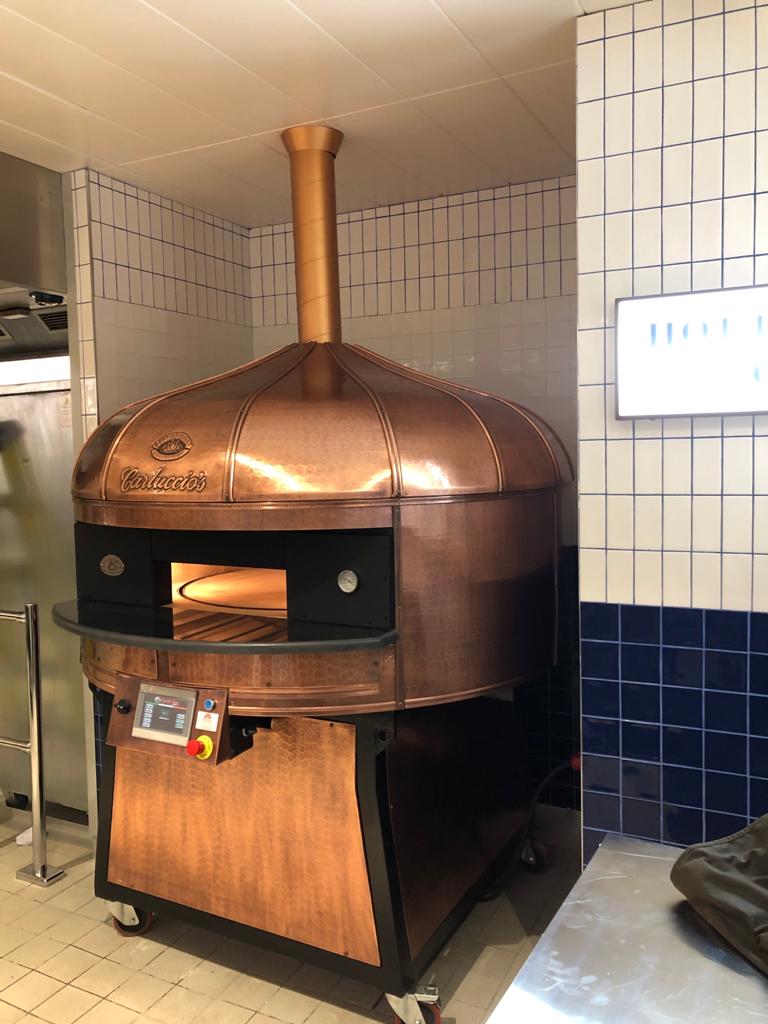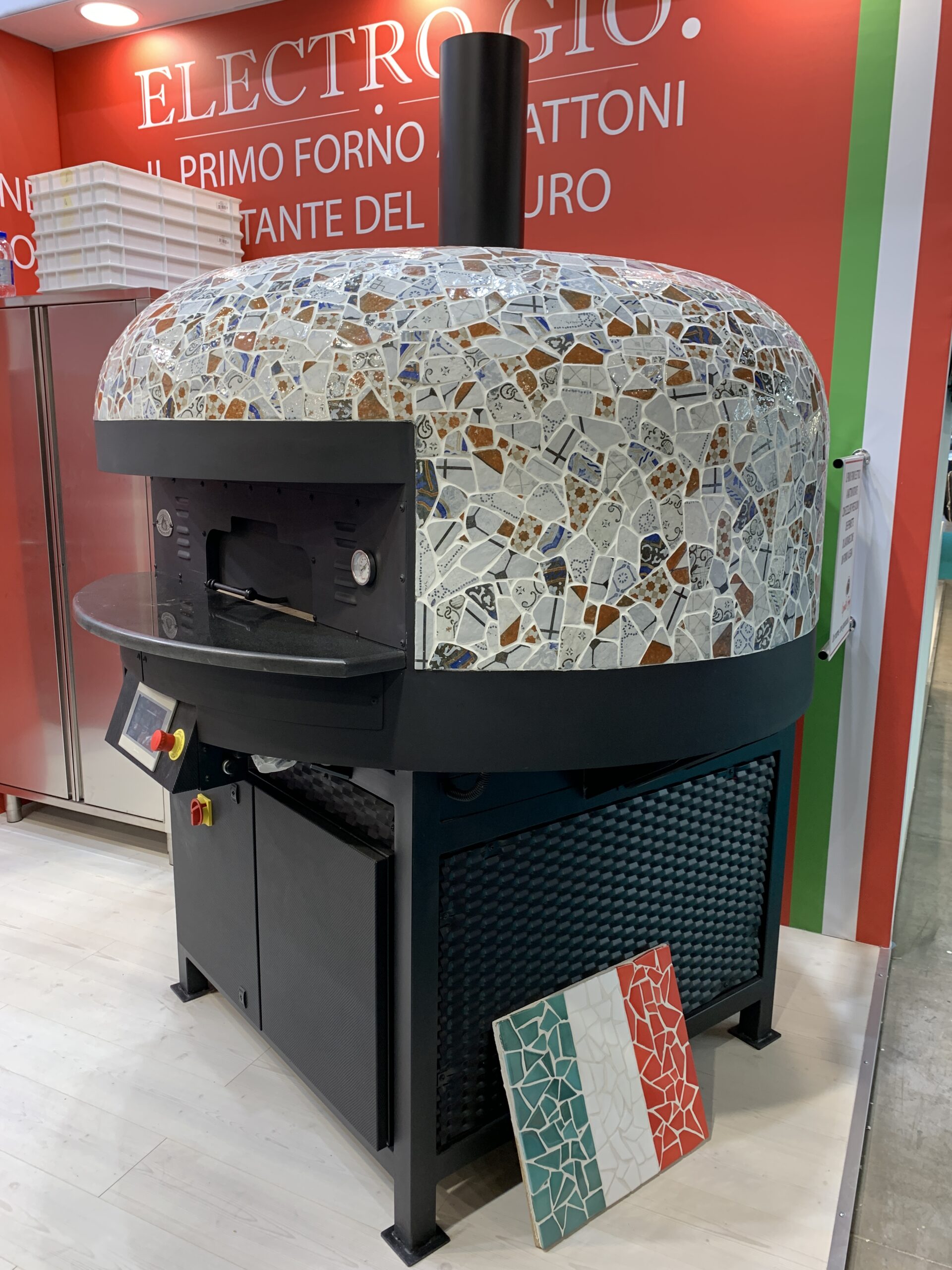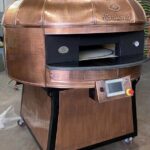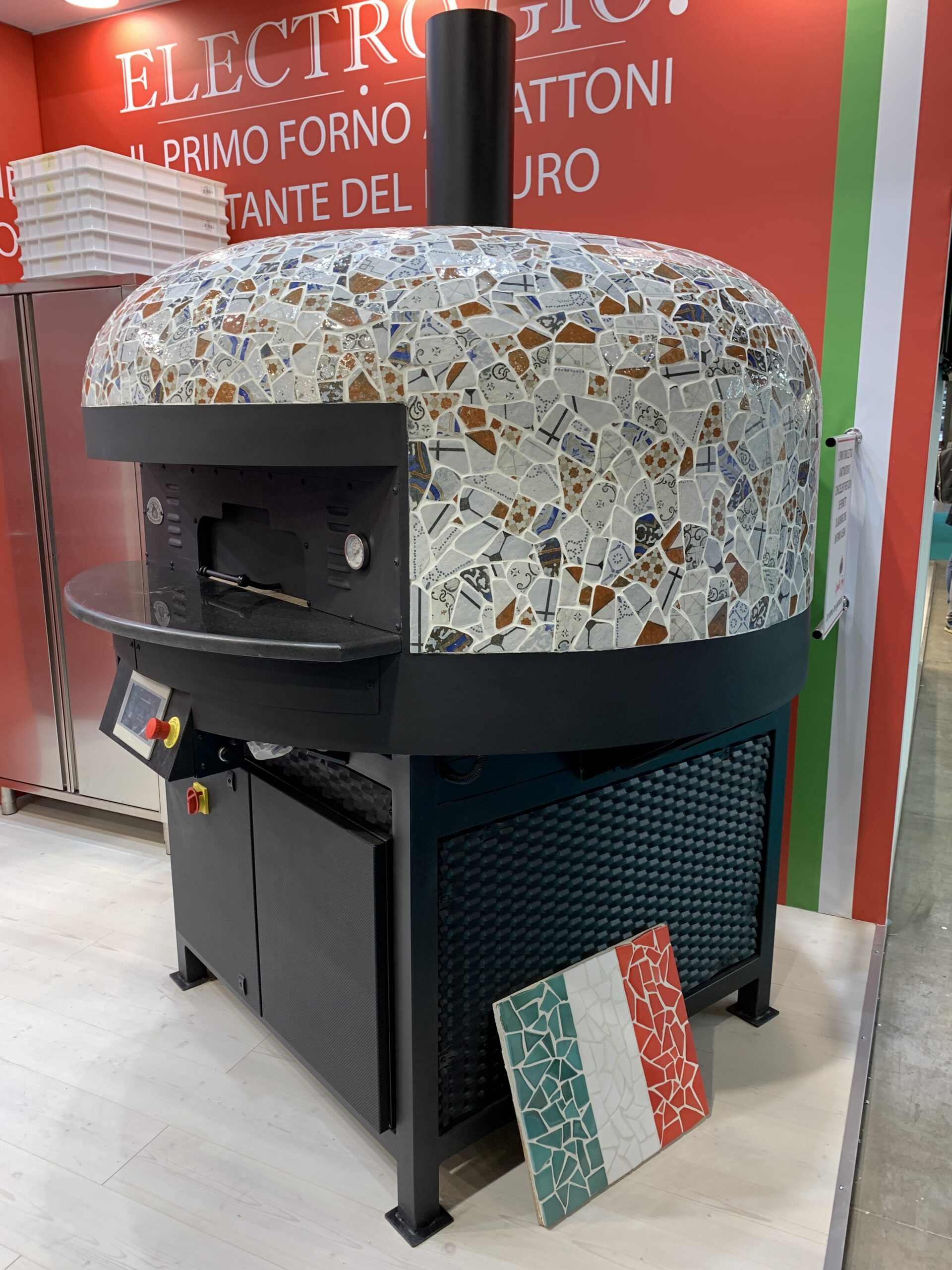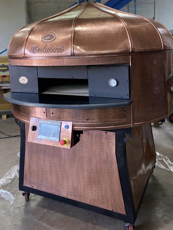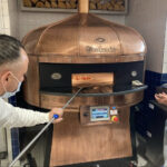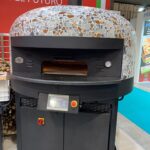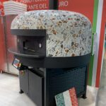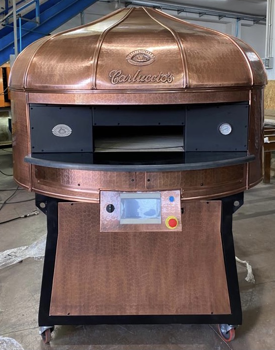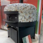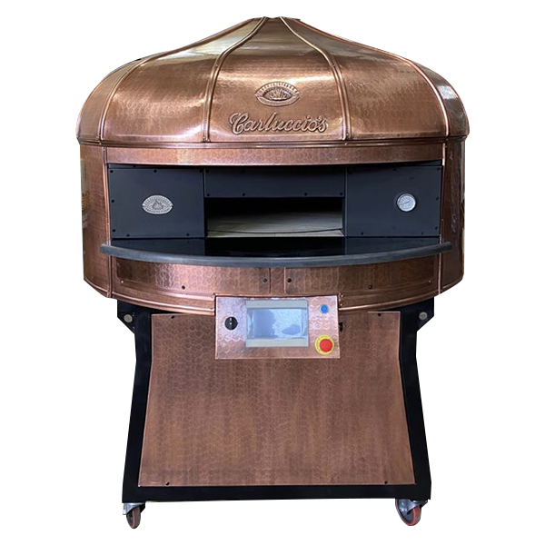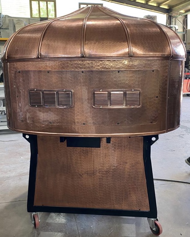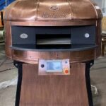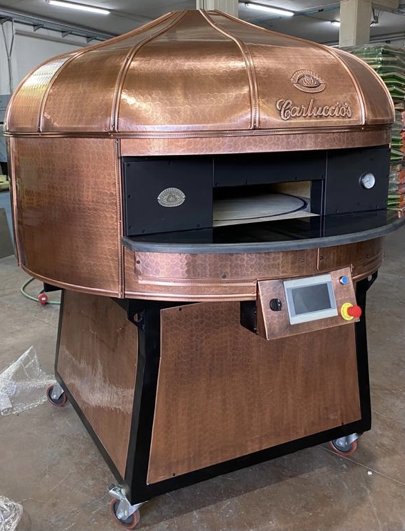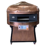 Electric Rotating Oven. The first electric oven with an always open-mouth, rotating floor and dome built with a traditional refractory bricks. It is the only electric oven which, although it is different, it reminds an authentic wood or gas dome oven. The strengths that characterise our oven are that it’s very easy to move with a simple pallet truck or by the installation of additional wheels and the fact that the oven arrives already assembled and ready for use. Cooking process is like in a real traditional wood-fired dome shape oven, meaning that heat is stored in refractory bricks resistant to 1200 ° C. Even after 12 hours from switching off, oven retains most of the heat. The electrical resistors resulting from a long research have been conceived and designed for cooking Pizza. By managing their electrical power, low energy consumption is also taken into consideration when enormous refractory mass is heated. The latest generation electronic components from high prestige industries are used in this oven what simplifies programming for the different ways of cooking suitable for the chef’s preferences. The cooking programs can be pre-set, customised, simplifying oven use to maximum so it can be used by any person. The oven is equipped with a cleaning drawer located below the resistance of the floor. The GOLD PLUS TOP thermal insulation reduces heat losses. The rotation of the floor is on demand and you can vary the speed. Installation is very simple by connecting a small extraction pipe to the central hood to allow vapours and odours to be removed. The finishes are multiple: classic dome entirely handmade using painted metals, stainless steel, mosaic, copper, brass, or materials supplied by the customers themselves to customise the design of your oven and making it unique and pleasing to the eye just like a traditional wood-burning oven.
