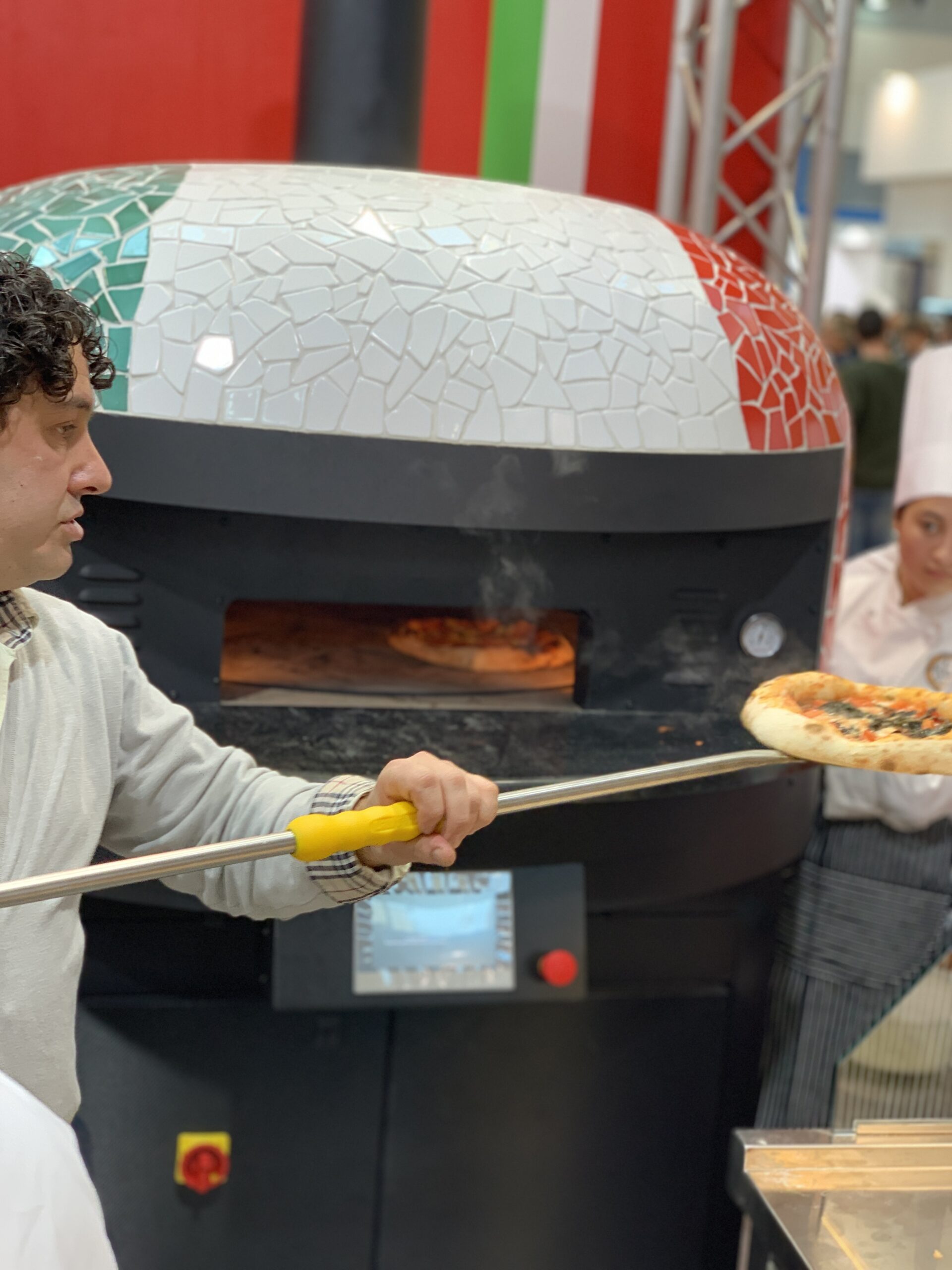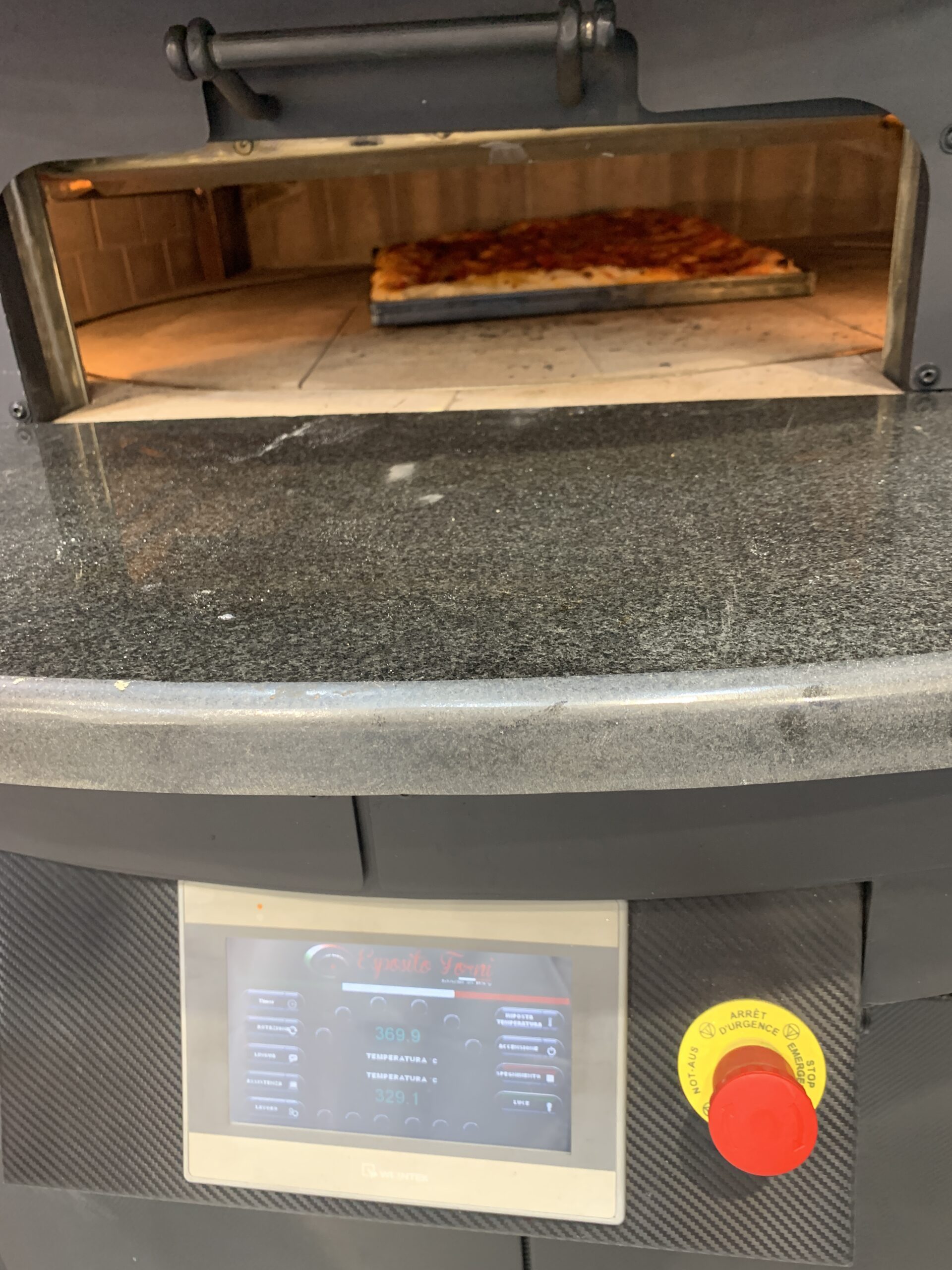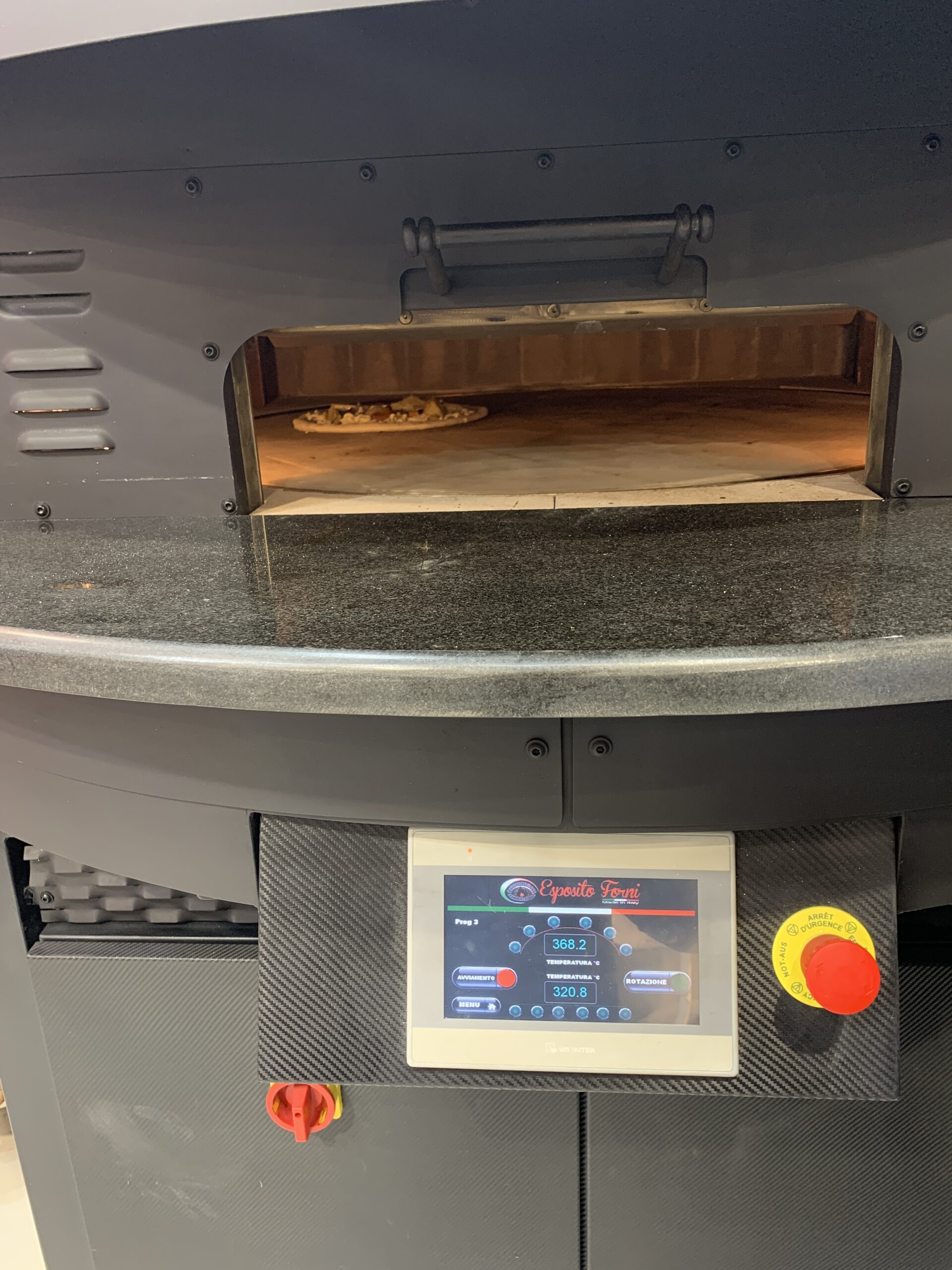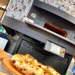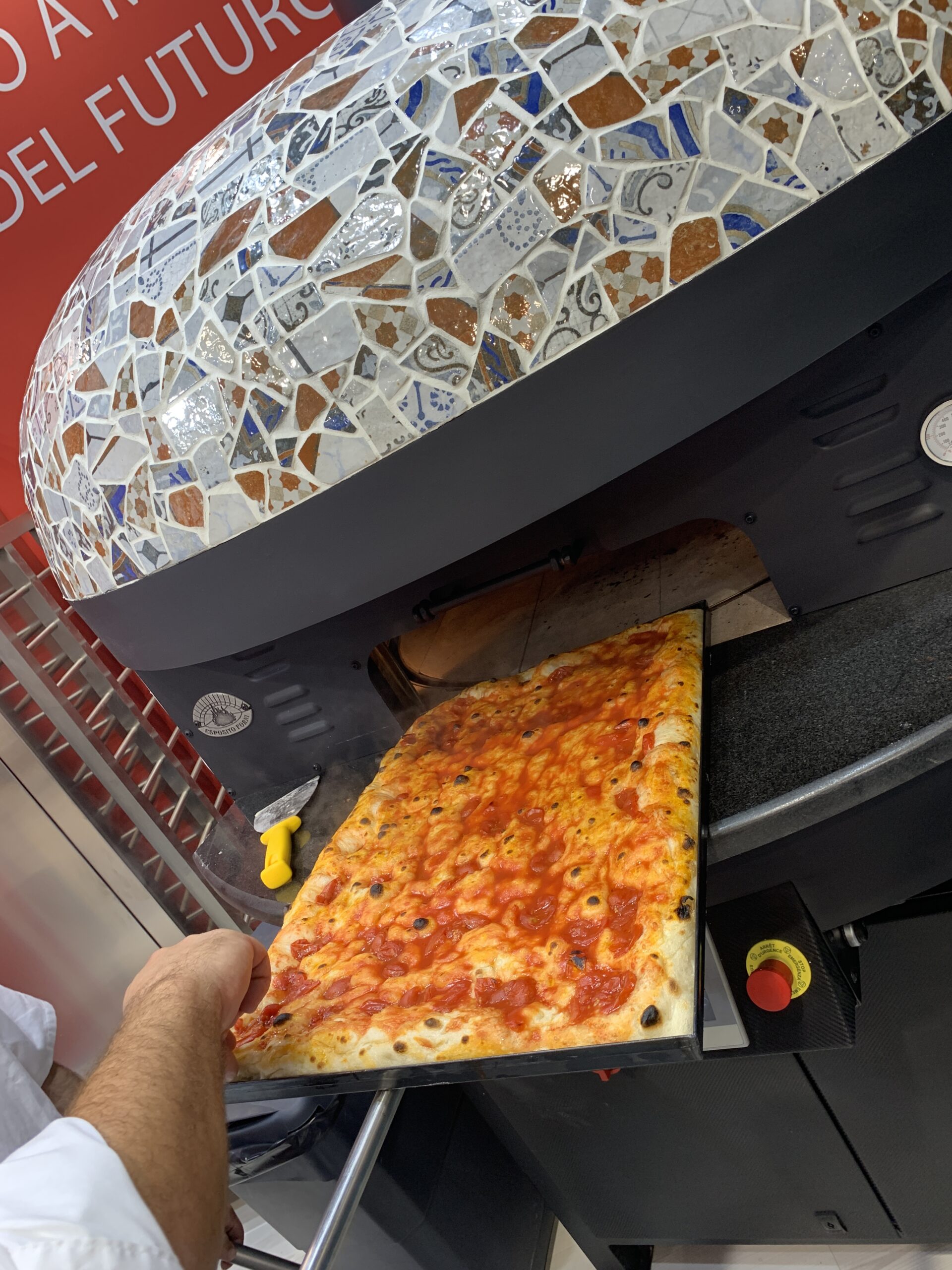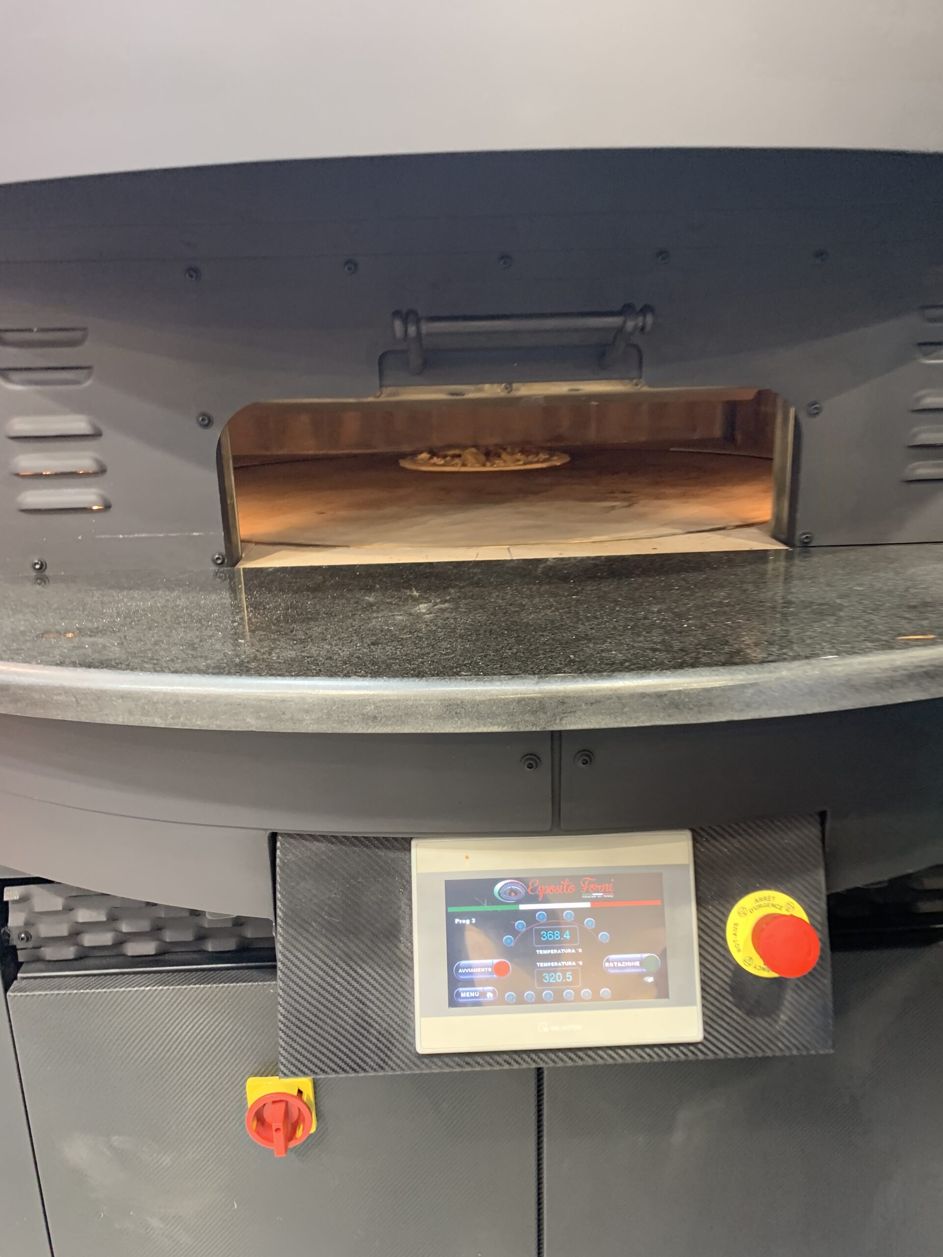 Electric Rotating Oven. The first electric oven with an always open-mouth, rotating floor and dome built with a traditional refractory bricks. It is the only electric oven which, although it is different, it reminds an authentic wood or gas dome oven. The strengths that characterise our oven are that it’s very easy to move with a simple pallet truck or by the installation of additional wheels and the fact that the oven arrives already assembled and ready for use. Cooking process is like in a real traditional wood-fired dome shape oven, meaning that heat is stored in refractory bricks resistant to 1200 ° C. Even after 12 hours from switching off, oven retains most of the heat. The electrical resistors resulting from a long research have been conceived and designed for cooking Pizza. By managing their electrical power, low energy consumption is also taken into consideration when enormous refractory mass is heated. The latest generation electronic components from high prestige industries are used in this oven what simplifies programming for the different ways of cooking suitable for the chef’s preferences. The cooking programs can be pre-set, customised, simplifying oven use to maximum so it can be used by any person. The oven is equipped with a cleaning drawer located below the resistance of the floor. The GOLD PLUS TOP thermal insulation reduces heat losses. The rotation of the floor is on demand and you can vary the speed. Installation is very simple by connecting a small extraction pipe to the central hood to allow vapours and odours to be removed. The finishes are multiple: classic dome entirely handmade using painted metals, stainless steel, mosaic, copper, brass, or materials supplied by the customers themselves to customise the design of your oven and making it unique and pleasing to the eye just like a traditional wood-burning oven.